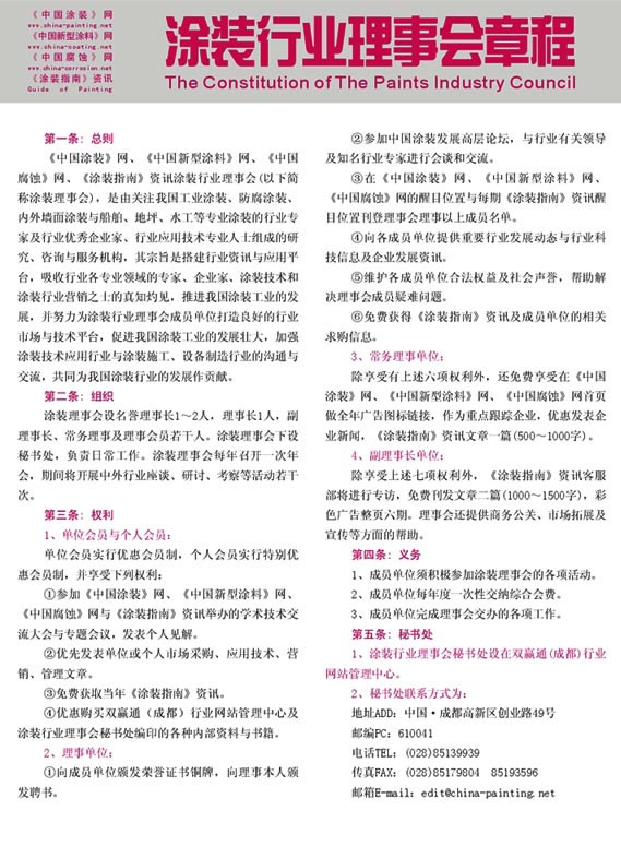 | 中国涂装首页 >>> 涂装理事会 >>> 涂装理事会章程 |