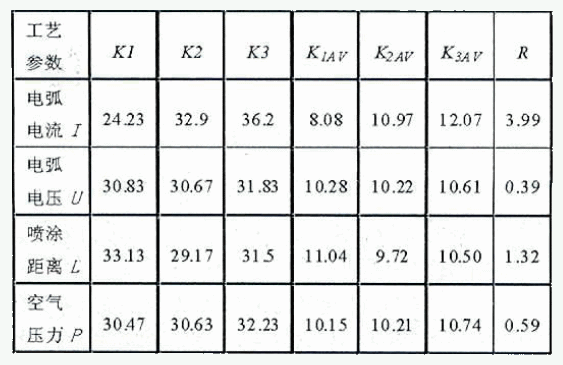 综上所述,考虑影响喷涂层耐磨性的主要因素,电弧电流A、电弧电压B、喷焊距离C、空气压力D作为试验因素,各因素水平如表1所示。