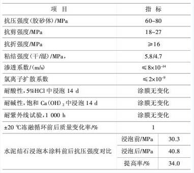 由于传统环氧涂料含有挥发性溶剂,一般固化后收缩率在20%~40%,因而由自身应力发生收缩就会导致保护层剥落。同时,传统环氧树脂的分子结构决定了它不亲水、具有疏水性的特点,即使分子量很小的环氧树脂自身黏度也较大,因此渗透性能与可灌性均较差,主要依靠其良好的粘结能力在结构外表面形成保护层,其固结体虽有一定韧性但又显脆性。通过研究,掌握了非活性稀释剂丙酮分子活化产生自缩聚和糠醛分子缩聚的条件和规律,筛选出合适的丙酮活化的催化剂和最佳用量范围,从而使丙酮参与了环氧树脂的固化反应,并加入另外几种改性剂,从而改变材料的渗透性、提高固结体的韧性。这种改性后的环氧材料即为高渗透改性环氧防水防腐涂料。该材料具有较高的渗透性能,涂刷后能沿着混凝土表面的毛细管道、微空隙和肉眼看不见的裂缝渗入,形成2 mm左右的固结层,该固结层力学强度比原混凝土的强度提高30%以上,最终起到防水防腐的作用。高渗透改性环氧材料初始性能见表1,固结体的物理性能指标见表2。