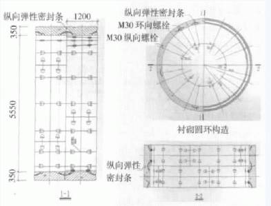2号线和3号线总计28个区间的盾构管片采取了外部强化防水防腐处理,涂刷过程在管片预制厂完成。这28个区间盾构由6块强度为C50、抗渗等级为S10的预制钢筋混凝土管片拼装而成,管片外径6.2m、厚度为350 mm、内径为5.5 m、环宽为1.2 m。块与块间用螺栓连接,拼装方式为错缝,管片间密封处理见图1。
