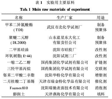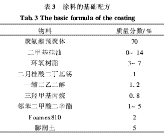 先将一定量的聚醚二元醇在高温下脱水,接着加入一定比例的TDI和催化剂,降温搅拌,获得聚氨酯预聚体。接着依次加入二甲基硅油、环氧树脂、扩链剂、交联剂、增塑剂、消泡剂和填料,控制反应时间和反应温度(指加完各种改性剂和助剂后的时间和温度),搅拌均匀后得到有机硅和环氧树脂复合改性的聚氨酯涂料。涂料的基础配方见表3,配料时,改变某些成分的添加量得到不同的涂料,制成漆膜后以作比较。