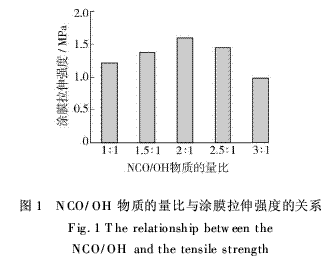 图1给出了NCO/OH物质的量比对涂膜拉伸强度的影响。由图1可见,随着NCO/OH物质的量比增大,涂膜的拉伸强度呈先上升后下降的趋势。这是由于NCO/OH物质的量比低于2∶1时,TDI加入量不足,反应后DL2000有残余;而NCO/OH物质的量比高于2∶1时,TDI加入过量,反应后TDI有单体残余。无论是DL2000还是TDI有残余,其两者的分子量都很低,夹杂在聚氨酯大分子中,会严重影响涂膜整体的拉伸强度,故只有在两种单体的加入量符合或尽量接近反应式配比,即NCO/OH物质的量比为2∶1时,聚合物中残余的单体最少,涂膜的拉伸强度才能达到最佳。