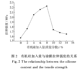 图2给出了有机硅加入量对涂膜拉伸强度的影响。由图2可见,随着有机硅加入量的增加,涂膜的拉伸强度呈先上升后下降的趋势。加入少量的有机硅时,其分子在生成聚合物的过程中逐渐穿插到聚氨酯大分子中去,形成嵌段或接枝结构。随着有机硅加入量的增加,嵌段或接枝程度越来越深,分子链逐渐增长,分子的作用力也越来越大,涂膜的拉伸强度随之增大。当有机硅加入量接近8%(质量分数)时,这种嵌段或接枝的程度达到饱和。继续加入有机硅时,有机硅以小分子形式残留下来,形成分子间作用力,当受到外界拉力作用时,这种分子间作用力远远小于聚合物的分子内作用力,故涂膜的拉伸强度下降。
