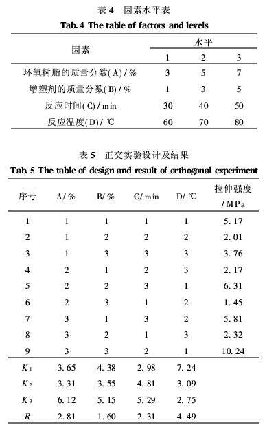 通过正交实验,以涂膜的拉伸强度为依据,确定环氧树脂和增塑剂的用量及反应时间、反应温度。因素水平表见表4,正交实验设计及结果见表5。通过分析极差,4种因素对涂膜平均拉伸强度影响的主次顺序依次为D,A,C,B,而最佳工艺参数为A3B3C3D1,即环氧树脂的质量分数为7%,增塑剂的质量分数为5%,反应时间为50min,反应温度为60℃。