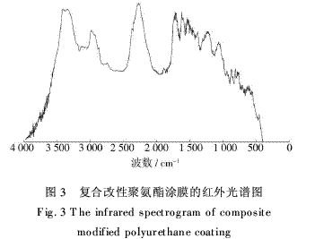 图3给出了复合改性聚氨酯涂膜的红外光谱分析结果。3300cm-1处的峰值表示-NCO与-OH反应得到的-NH的吸收振动峰,2873cm-1处的峰值表示C-H的吸收振动峰,2258cm-1处的峰值表示-NCO的存在,1732cm-1左右处的峰值表示氨酯键中羰基-CO的伸缩振动峰。由此看来,-NCO与-OH确实发生反应生成了新的-NHCOO-基团。1107cm-1附近有表示醚键C-O-C伸缩振动的强吸收谱带,有机硅中的-Si-O-Si-基团的吸收峰与此重叠;915cm-1处出现的吸收强峰为环氧基的吸收峰。这说明有机硅和环氧树脂确实与聚氨酯发生了反应。3475cm-1左右处未出现-OH的振动峰,表明-OH已经反应完全。