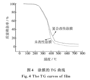 图4给出了复合改性聚氨酯涂膜和未改性聚氨酯涂膜的热重分析结果。改性涂膜的起始分解温度ti为267.39℃,未改性涂膜的ti为236.51℃;改性涂膜的50%(质量分数)热失重温度为383.63℃,未改性涂膜为355.12℃;改性涂膜的热反应终止温度tf为753.47℃,未改性涂膜的tf为632.50℃。改性涂膜在ti~tf之间的热质量损失率为83.157%,而未改性涂膜则为96.580%。这些数据表明,聚氨酯涂料被有机硅、环氧树脂复合改性之后,热稳定性大大提高。这是由于体系中的有机硅、环氧树脂和聚氨酯形成了互穿网络聚合物,相与相之间不仅有物理缠结,还有化学接枝,从而增加了网络的相容性,体现出较高的热稳定性能。