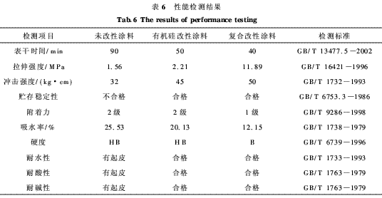 实验中根据国家标准对比检测了未改性涂料、有机硅改性涂料、有机硅和环氧树脂复合改性涂料的各方面性能,检测结果见表6。