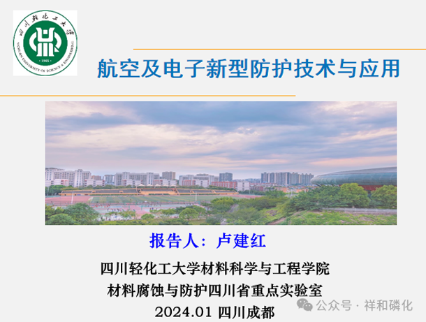 四川轻化工大学教授、博士,省涂料涂装专委会副主任、专委会高级专家卢建红先生,报告的题目是《航空及电子新型防护技术与应用》。