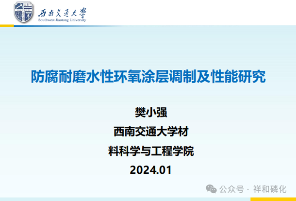 西南交通大学材料科学与工程学院院长助理、教授,省涂料涂装专业委员会副主任、专委会高级专家樊小强先生,报告的题目是《防腐耐磨水性环氧涂层调剂及性能研究》。
