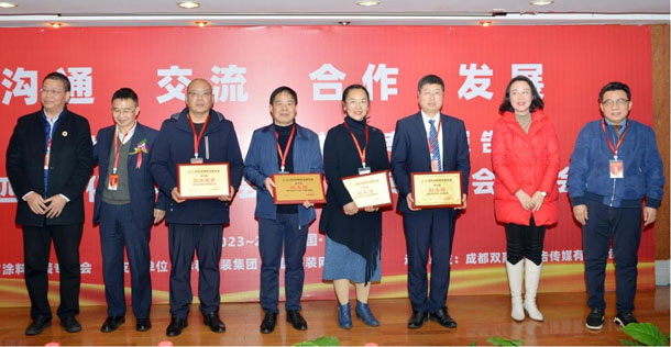 出席四川省化学化工学会涂料涂装专委会会员大会的四川省汽车服务行业协会执行会长兼秘书长蔡艳女士(右二),与伍泽涌主任委员(右一)及其他出席会议的嘉宾一道,为四川省涂料涂装专委会会员颁发铜牌。